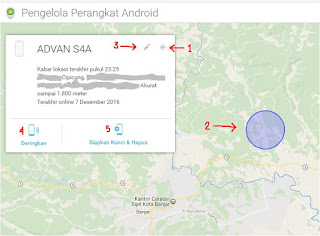 Cara menggunakannya cukup mudah,anda tinggal mengklik icon lokasi pada Android Device Manager tersebut lihat tanda pada gambar yang ditunjukan oleh nomor 1.